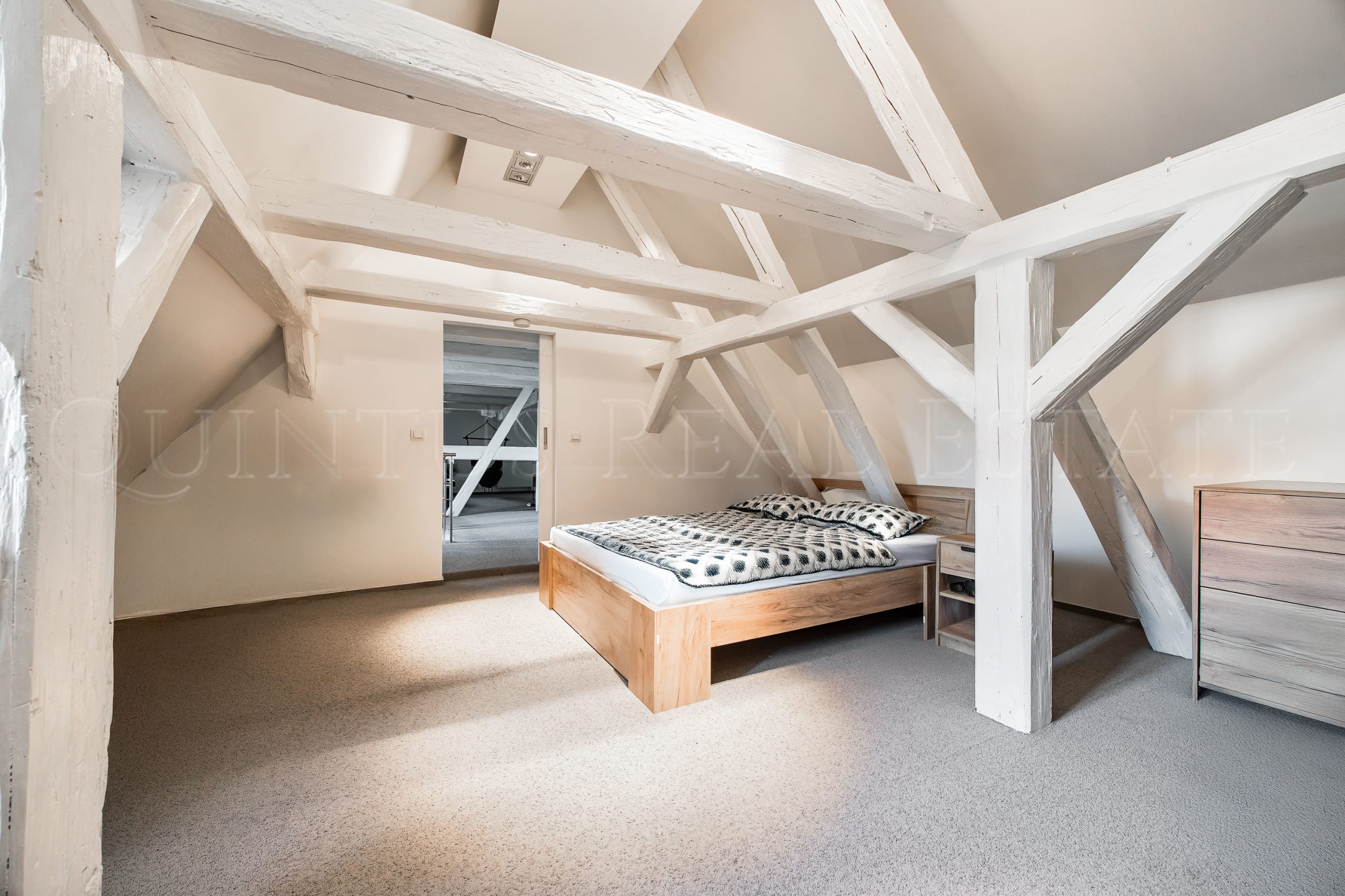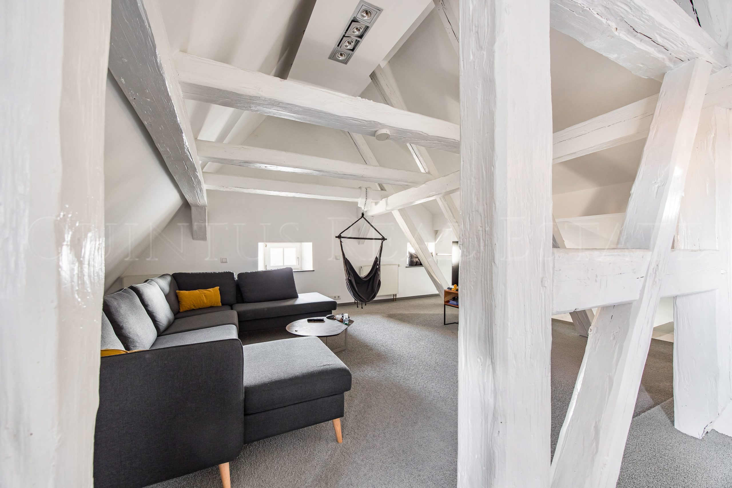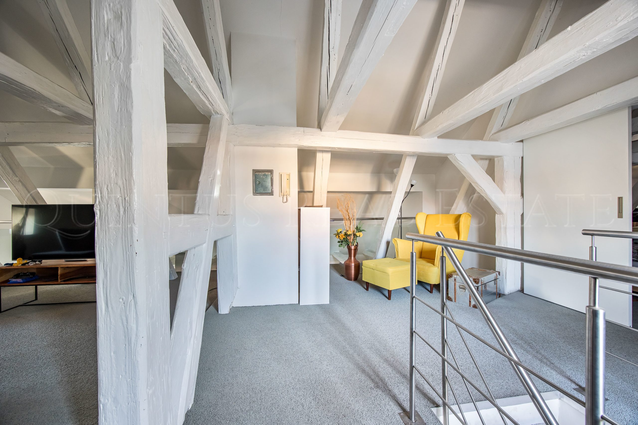 Über einen gemeinsamen Eingangsbereich erschlossen, bildet das Obergeschoss gemeinsam mit dem Dachgeschoss eine eigenständige Wohneinheit mit rund 184 m² Wohnfläche. Die insgesamt fünf Zimmer verteilen sich harmonisch auf beide Ebenen und werden durch den klassischen Altbaucharakter mit sichtbaren Holzbalken geprägt. Im Obergeschoss befinden sich die zentralen Wohnräume mit Küche und Essbereich sowie ein voll ausgestattetes Badezimmer. Das Dachgeschoss ist als offen gestalteter Wohnbereich mit Sichtdachstuhl ausgeführt und steht in direkter Blickbeziehung zur Küche und zum Essbereich im Obergeschoss. Ergänzt wird diese Ebene durch ein separates Schlafzimmer mit eigenem Badezimmer, das einen ruhigen und klar abgegrenzten Rückzugsbereich bildet. Die Wohneinheit wird im Februar 2026 frei und eignet sich sowohl zur Eigennutzung als auch für eine hochwertige Neuvermietung.