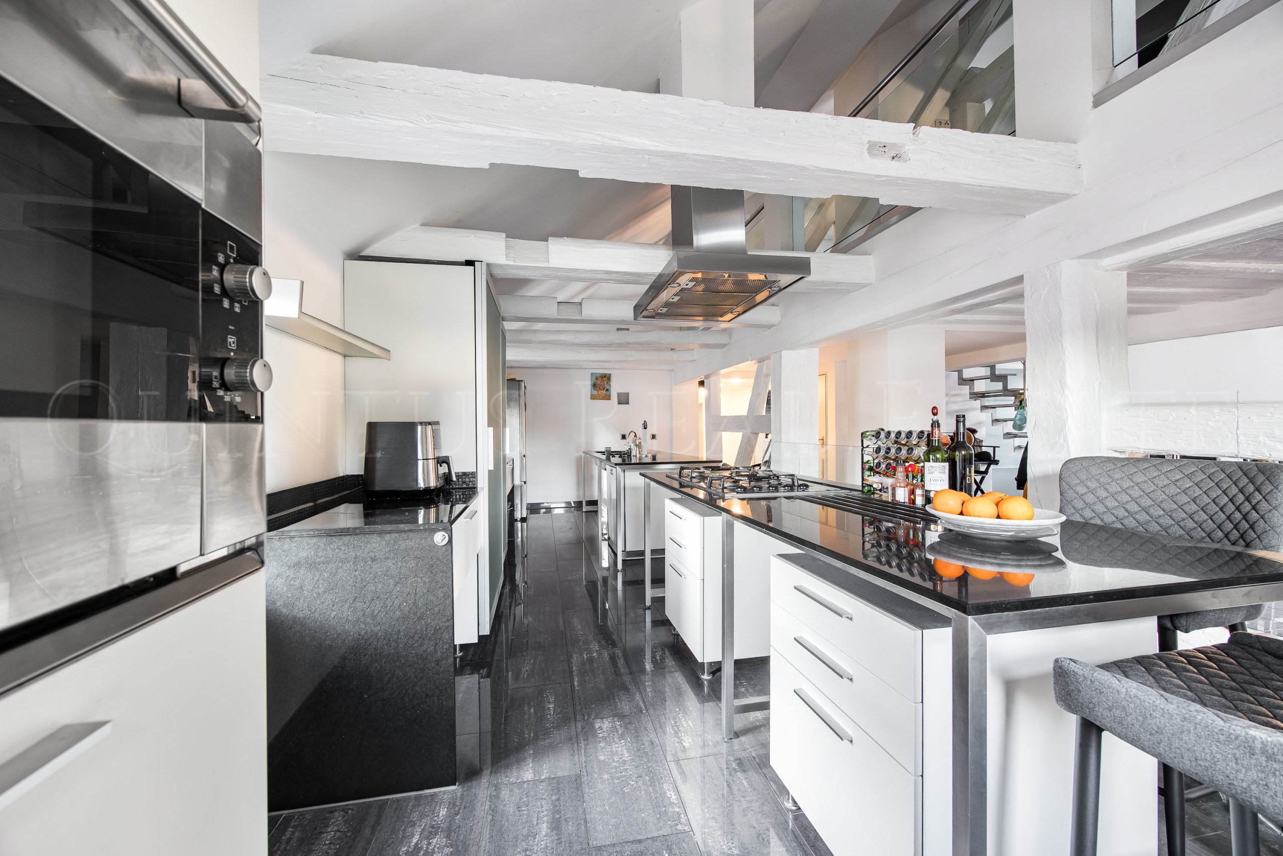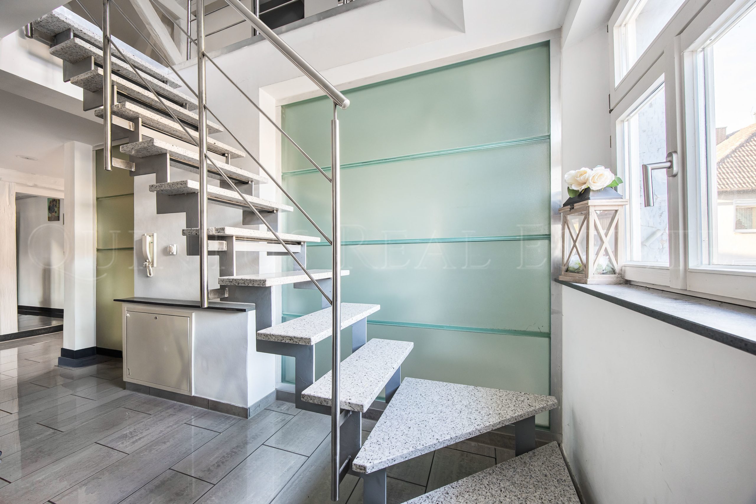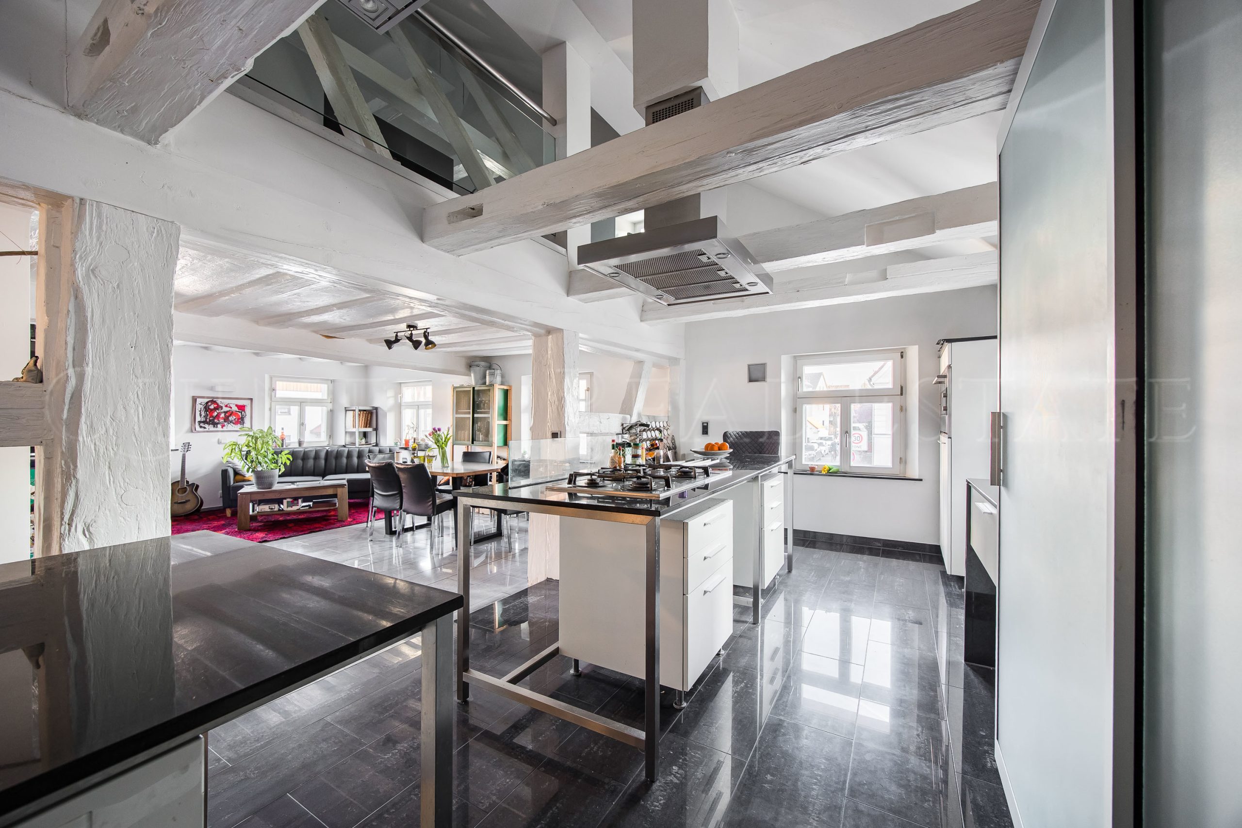 Über einen gemeinsamen Eingangsbereich erschlossen, bildet das Obergeschoss gemeinsam mit dem Dachgeschoss eine eigenständige Wohneinheit mit rund 184 m² Wohnfläche. Die insgesamt fünf Zimmer verteilen sich harmonisch auf beide Ebenen und werden durch den klassischen Altbaucharakter mit sichtbaren Holzbalken geprägt. Im Obergeschoss befinden sich die zentralen Wohnräume mit Küche und Essbereich sowie ein voll ausgestattetes Badezimmer. Das Dachgeschoss ist als offen gestalteter Wohnbereich mit Sichtdachstuhl ausgeführt und steht in direkter Blickbeziehung zur Küche und zum Essbereich im Obergeschoss. Ergänzt wird diese Ebene durch ein separates Schlafzimmer mit eigenem Badezimmer, das einen ruhigen und klar abgegrenzten Rückzugsbereich bildet. Die Wohneinheit wird im Februar 2026 frei und eignet sich sowohl zur Eigennutzung als auch für eine hochwertige Neuvermietung.