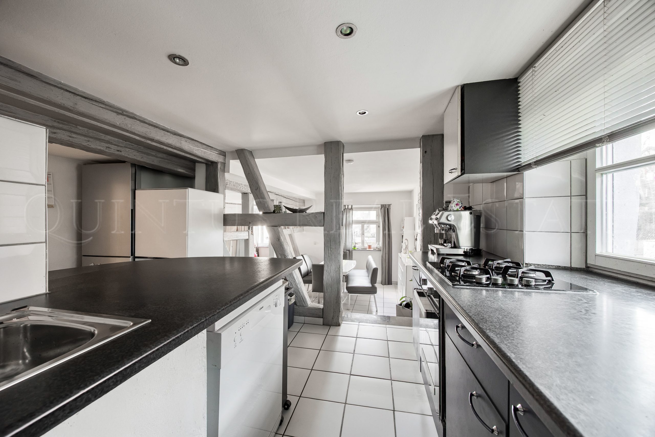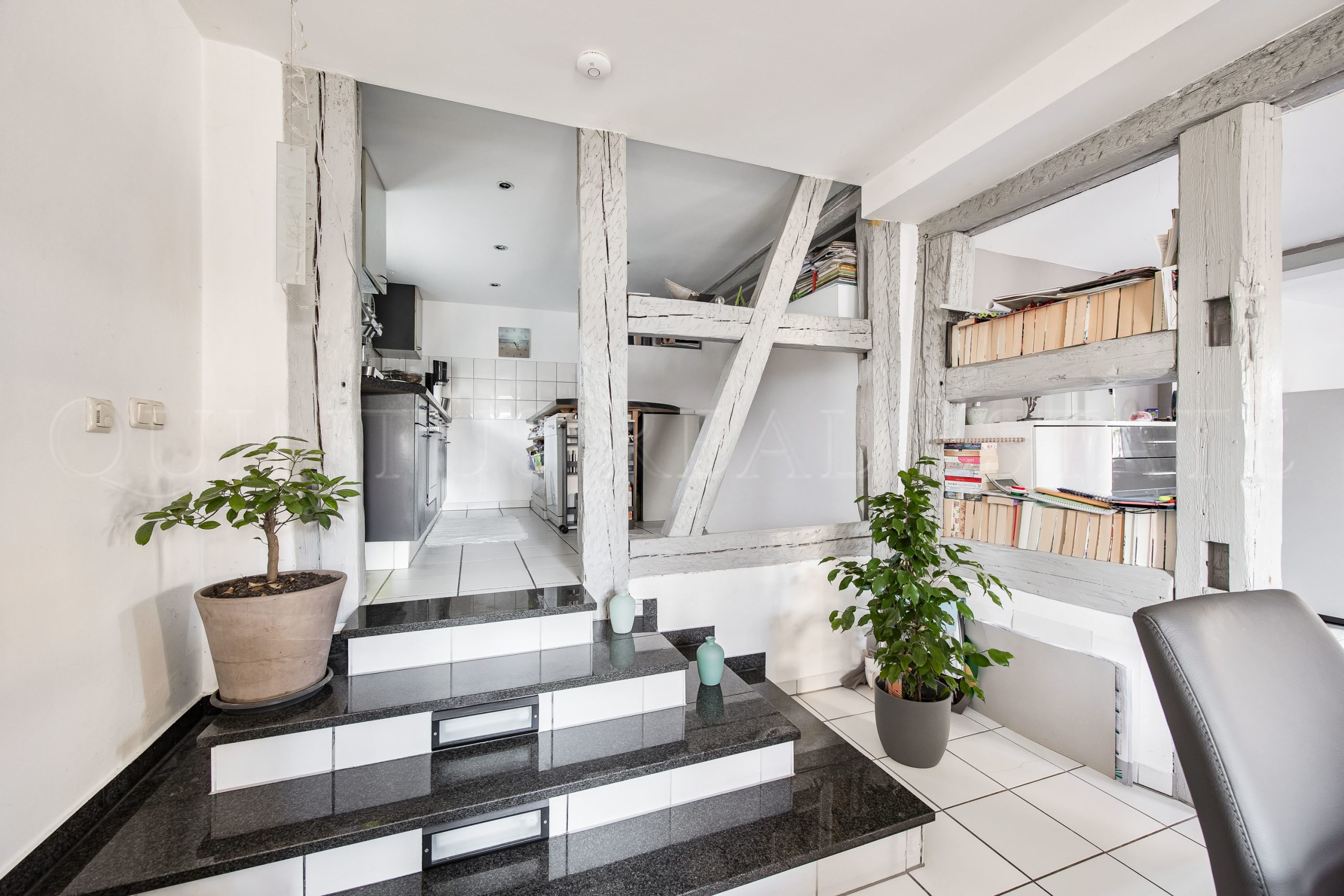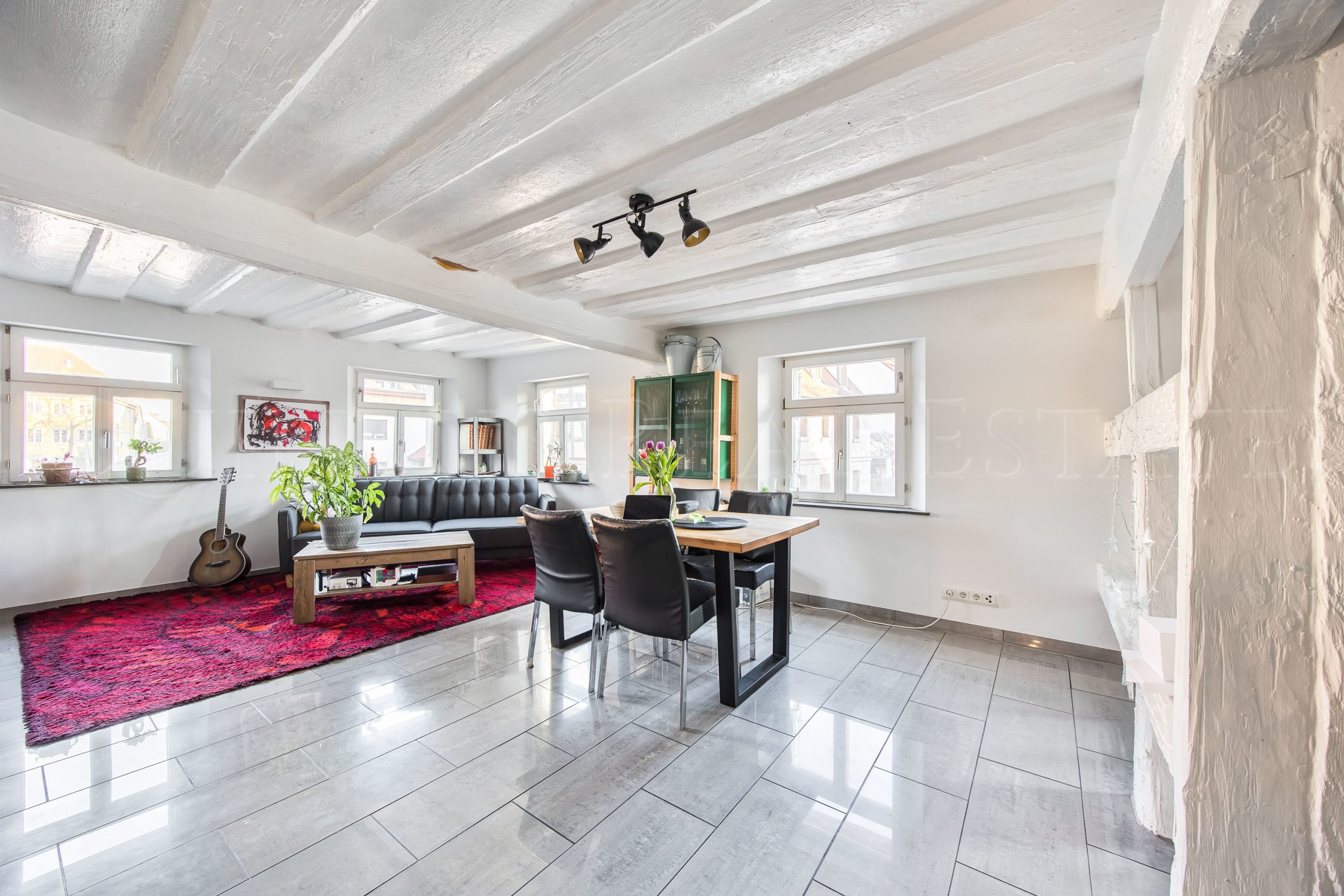 Das denkmalgeschützte Wohnhaus aus dem Jahr 1580 präsentiert sich als klassischer, zweigeschossiger Satteldachbau mit massiven Sandsteinquadern und verputztem Fachwerk. Die historische Bausubstanz prägt das gesamte Gebäude und zeigt sich im Inneren durch sichtbare Holzbalken, die den typischen Altbaucharakter konsequent fortführen und den Räumen eine warme, authentische Atmosphäre verleihen.