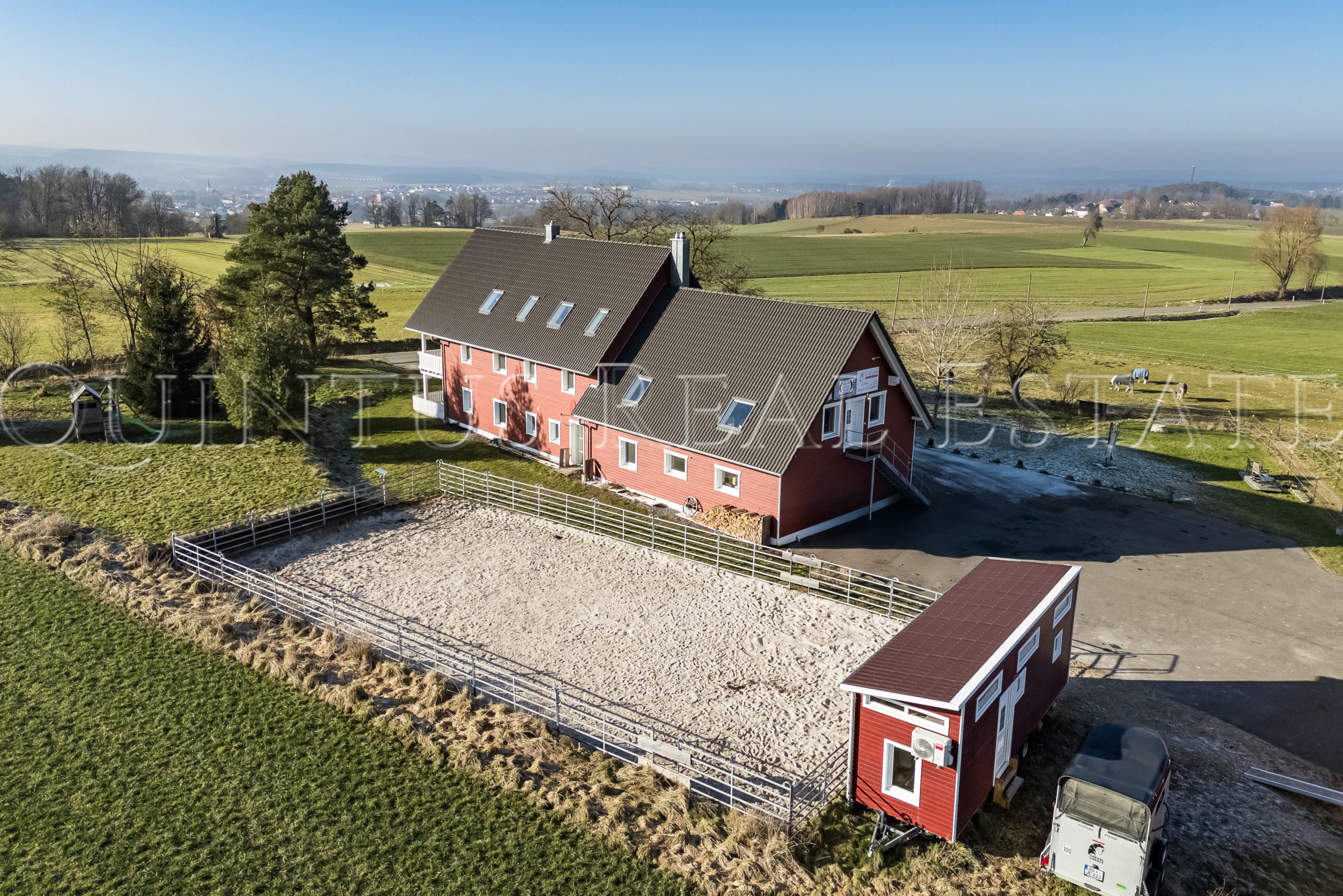Besonders hervorzuheben ist die genehmigte Bauplanung einer ca. 650 m² großen Reit- und Bewegungshalle mit acht Pferdeboxen und Paddocks. Aufgrund der gewerblichen Widmung bietet die Fläche grundsätzlich auch Potenzial für die Beantragung weiterer Nutzungen, wie etwa als Fahrzeug- und Oldtimerlager, Werkstatt oder für Veranstaltungen und Events.