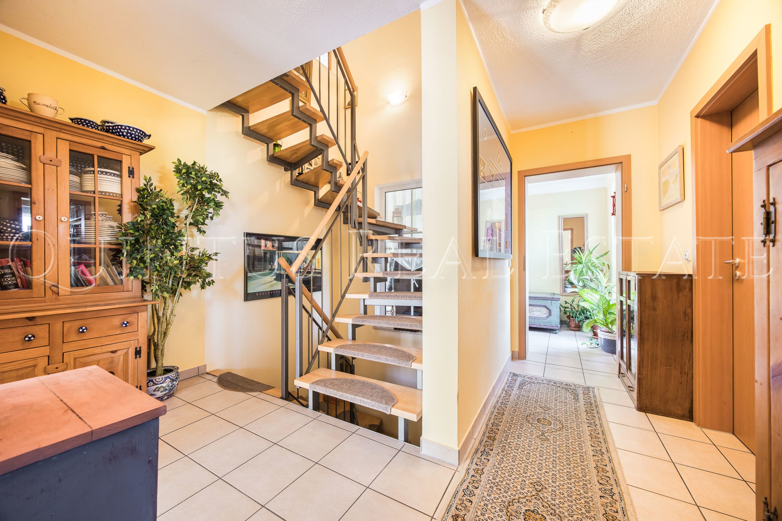 Das Haus ist voll unterkellert. Im Untergeschoss befinden sich ein Hauswirtschaftsraum mit Anschlüssen für Waschmaschine und Trockner, ein weiteres Duschbad mit WC, ein Lager- bzw. Hobbyraum sowie ein beheizbarer Raum mit großem Fenster und Lichtgraben, der ebenfalls flexibel genutzt werden kann. Die Beheizung erfolgt über eine Öl-Zentralheizung mit integrierter Warmwasserbereitung. Kunststofffenster mit Wärmeschutzverglasung und Rollläden sind ebenso verbaut wie eine offene Stahlharfentreppe mit Trittstufen in Buche. Die Böden sind in den Wohn- und Schlafbereichen mit Laminat versehen, während Fliesen in den funktionalen Zonen für pflegeleichte Oberflächen sorgen.