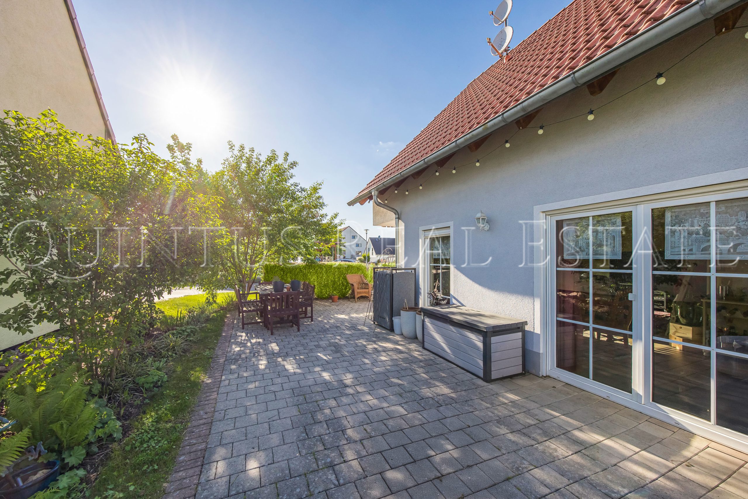 Die Doppelgarage ist mit zwei elektrisch betriebenen Sektionaltoren ausgestattet und direkt mit dem Wohnhaus verbunden. So bleibt der Zugang auch bei schlechtem Wetter trocken und komfortabel. Zusätzliche Stellplätze befinden sich auf der gepflasterten Einfahrt. Der Garten ist pflegeleicht und in Richtung Süden angelegt und verfügt über ein separates Gartenhaus.