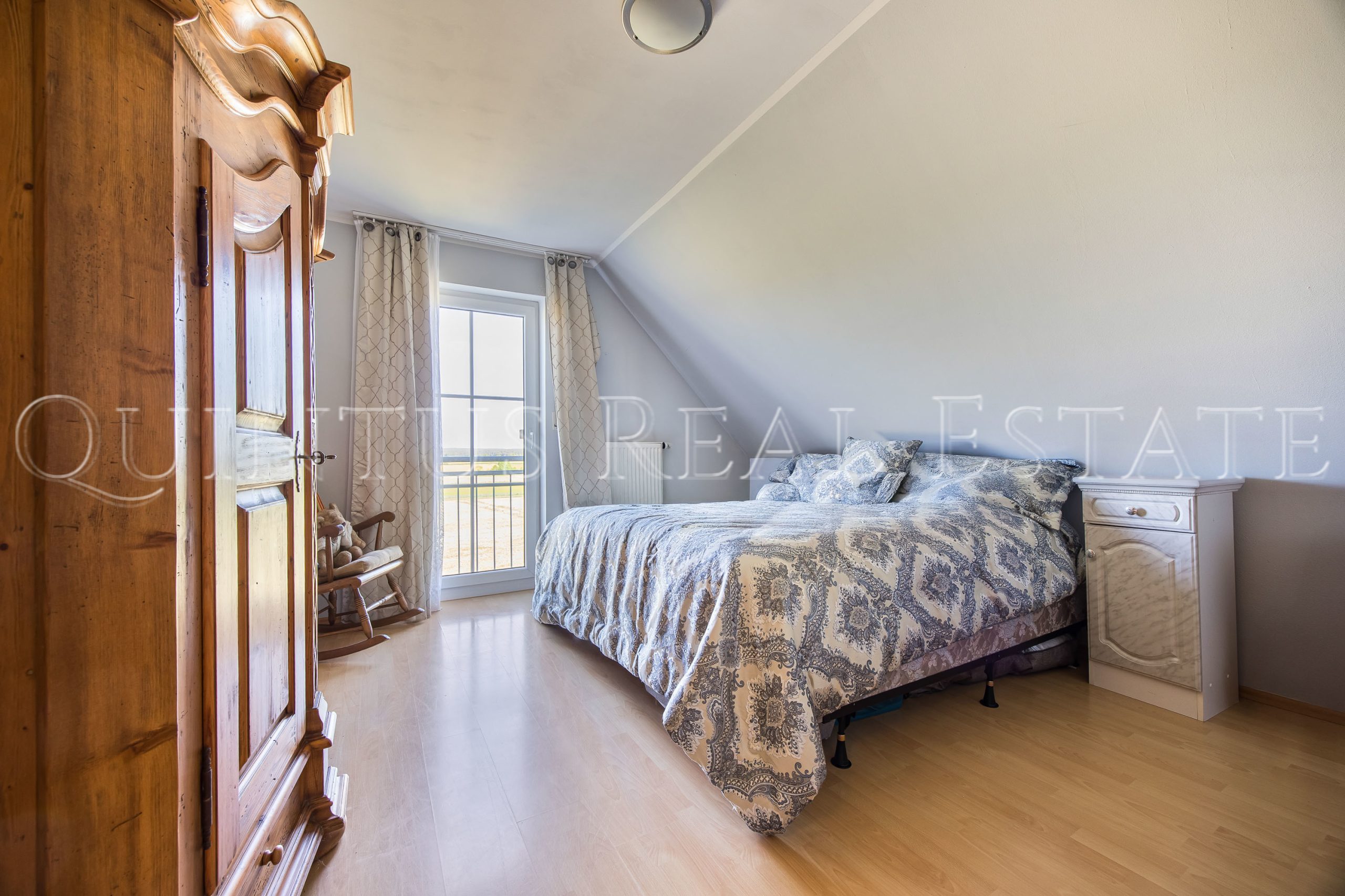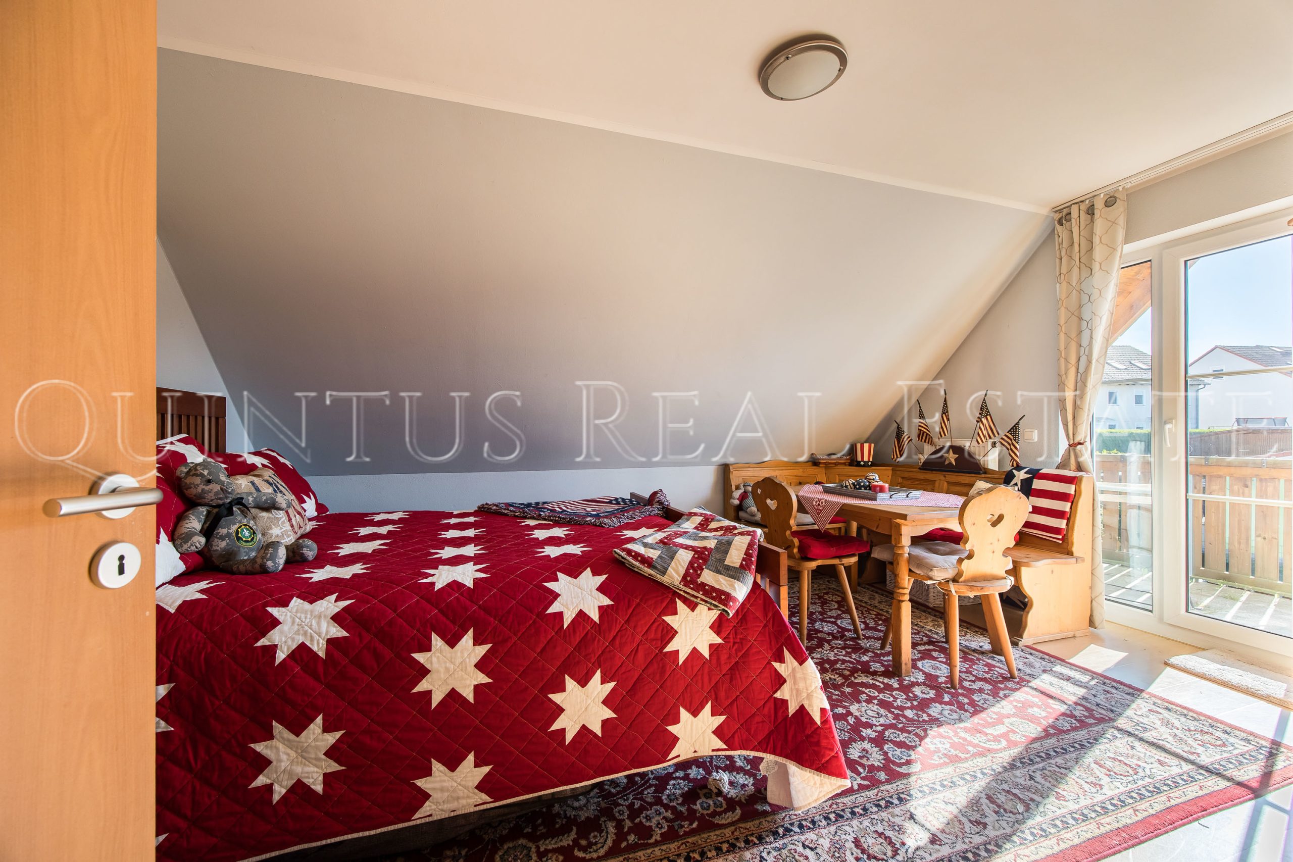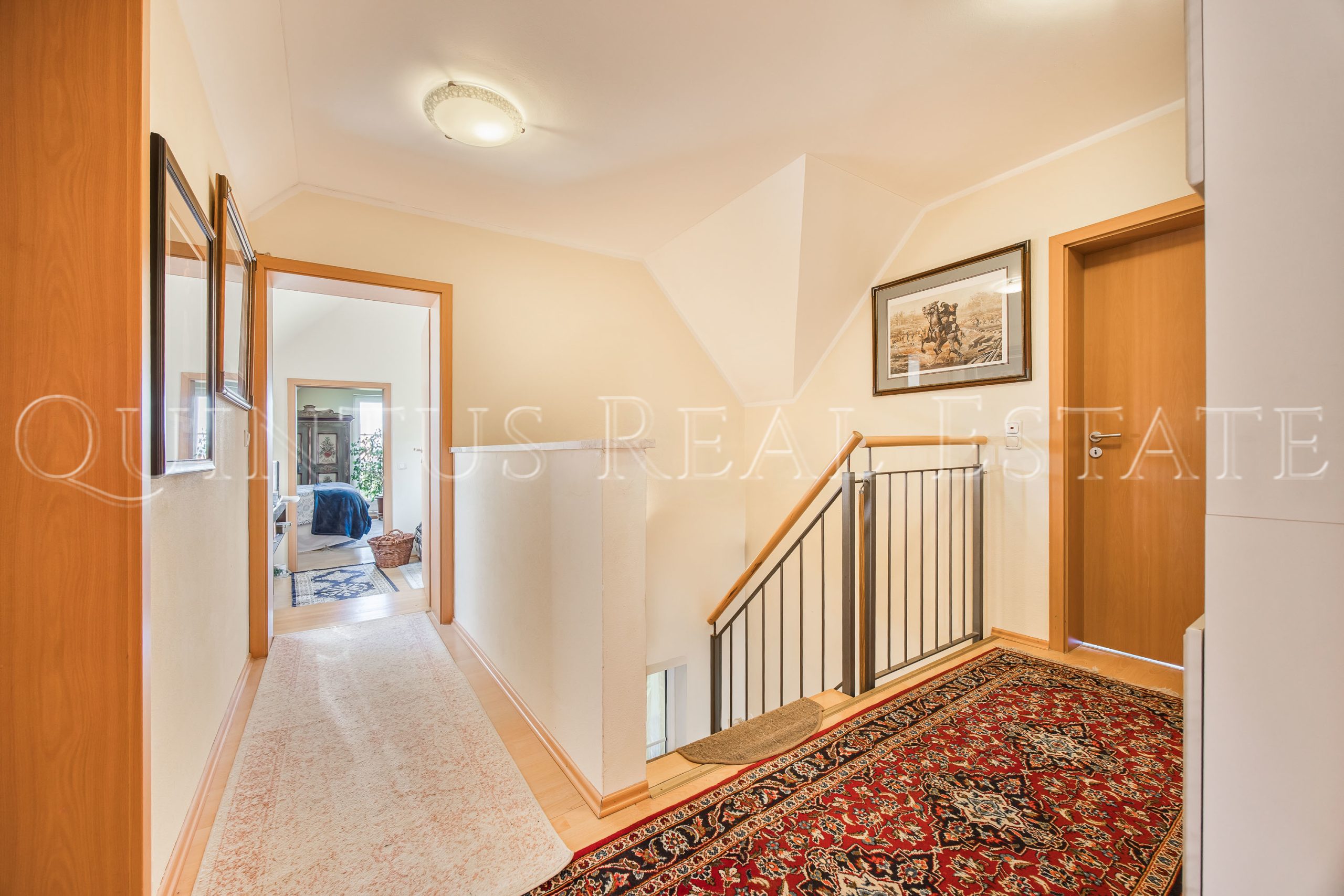Im Obergeschoss stehen drei gut geschnittene Schlafzimmer zur Verfügung, zwei davon mit Zugang zum überdachten Balkon. Das großzügige Tageslichtbad ist mit Badewanne, Dusche, Doppelwaschbecken und WC ausgestattet. Über der direkt ans Haus angebundenen Doppelgarage wurde zusätzlich ein wohnlich ausgebautes Studio geschaffen, ergänzt durch einen weiteren Raum im Durchgang – ideal für Gäste, als Homeoffice oder Hobbybereich.