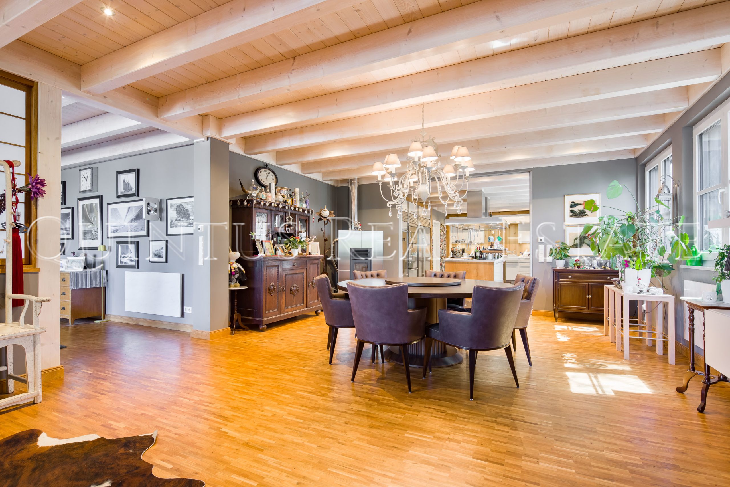 Das 2011 in Holzständerbauweise errichtete Wohnhaus lässt sich durch die großzügige Aufteilung von 6 Zimmern auf eine Gesamtwohnfläche von ca. 332 m², die gehobene Ausstattung der Einbaugeräte und Sanitäreinrichtungen, sowie zahlreicher Extras als luxuriös bezeichnen. Der Zugang ist sowohl aus den Geschäftsräumen als auch durch eine separate Eingangstür in das Treppenhaus mit ca. 7 m Höhe gegeben. Hier finden sich zwei Räume, die sich als Gäste- oder Arbeitszimmer bzw. geräumige Ankleide nutzen lassen.